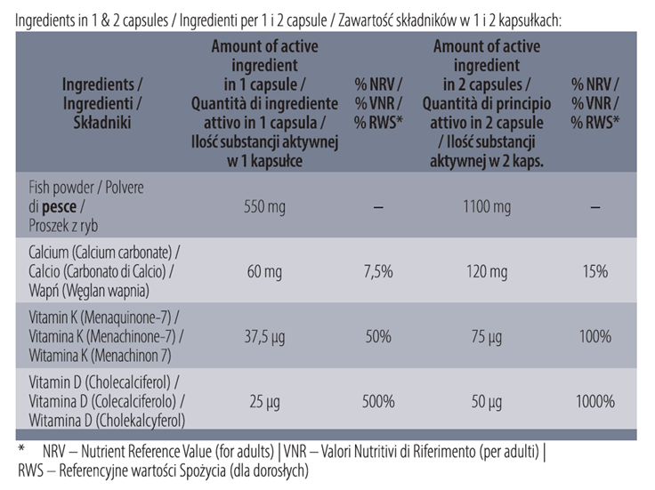 Ingrédients : Poudre de poisson, calcium (carbonate de calcium), gélatine de poisson, vitamine K (ménaquinone-7), vitamine D (cholécalciférol), agent anti-agglomérant (sels de magnésium des acides gras).